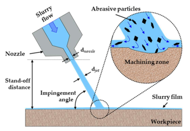 ——基于非牛顿流体流变特性实现工件曲面的柔性抛光技术,当施加到浆料上的剪切应变率超过临界值时,STP浆料的流变特性会发生变化,浆料粘度急剧上升后转变为可适应各种曲面抛光的柔性磨具。简单描述即使磨料颗粒与流体(气体或液体)混合,形成磨料射流冲击工件表面,一般用于光学应用的石英玻璃抛光,可使用胶体二氧化硅和胶体氧化铈作为磨粒。