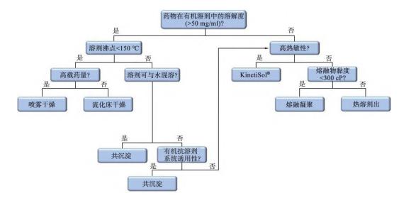 共沉淀法 | 将反溶剂逐渐滴加到溶有药物和聚合物的溶液中,从而使二者共同沉淀以获得SDs,相对简单,成本较低而且放大起来相对容易;可以通过配方设计和调节沉淀过程来精确控制产品的多种晶型或尺寸 | 可以满足直接加工的需要,还可以通过快速共沉淀制备无定型纳米颗粒;显著缺点是洗涤和干燥过程中存在的热、湿气可能会引起SDs重结晶。 |