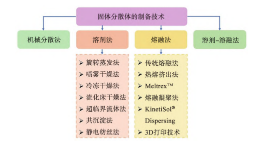 虽然SDs可以通过各种制备技术进行生产,但是它们形成的基本原理是一致的。首先将药物和载体混合均匀,然后通过将混合体系加热熔融或溶解在有机溶剂中以破坏药物的晶格结构,最后将系统快速冷却或干燥得到SDs。SDs的各种制备技术都源于熔融法、溶剂法、溶剂-熔融法、机械分散法等方法。