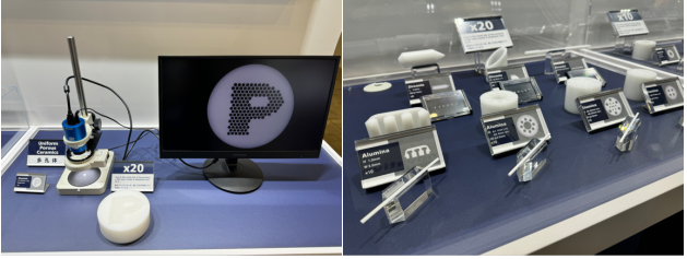亲临展会现场,可以清晰地感受到日本企业展品的显著特色依然是“精细”二字。例如,知名文具制造商PILOT(百乐)公司也来做陶瓷了,而且还很擅长利用挤出成型技术制造出精巧的“微陶瓷”产品。这项技术源于其制造自动铅笔笔芯的经验,使陶瓷材料在高强度、高纯度的前提下,通过专门研发的挤出成型设备和烧结工艺实现微米级内外径尺寸控制和亚微米级光滑表面。这些多孔陶瓷通过均匀的线性孔结构可实现非常均匀的气体和液体的流量控制,同时减少压力损失,被广泛应用于半导体设备中的过滤器、喷嘴、流量控制器等。由于陶瓷件尺寸实在太微小,其展台上还贴心展示了放大的树脂模型,方便观众观察其形貌特点。