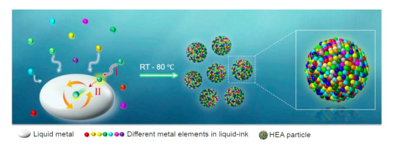 现有的制造高熵合金的方法是将元素加热到高温,使原子具有大量的动能,将不同的元素混合成一个整体,然后通过各种方法快速降温。认为这种急剧的温度变化是必要的,以锁定由高能原子引起的内部无序状态。伯克利实验室团队的方法通过在液态金属镓中混合将构成高熵合金的元素,在较低且恒定的温度(舒适的25-80摄氏度,或77-186华氏度)下实现了相同高熵的结果。这些元素以氯化物形式溶解在水基溶液中。当酸性液体与液态镓在温暖至热的温度相遇时,元素迅速摆脱氯原子并混合在一起,然后固化成高熵合金。根据团队负责人郑海梅的说法,郑海梅是材料科学部的高级科学家和加州大学伯克利分校的客座教授,这种反应和在液-液界面的混合速度之快是捕获所渴望的熵的关键。