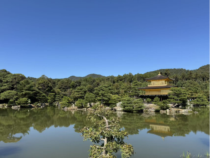 随后团队游览了京都著名地标——金阁寺,这座建于1379年的寺庙,因其独特的建筑风格和深远的文化意义而被列入世界文化遗产。其最大的特色,是那两层覆盖着纯金箔的外墙,即便是在寒冷的冬日或是昏黄的傍晚,也能闪闪发光,展示出不同的美态。
