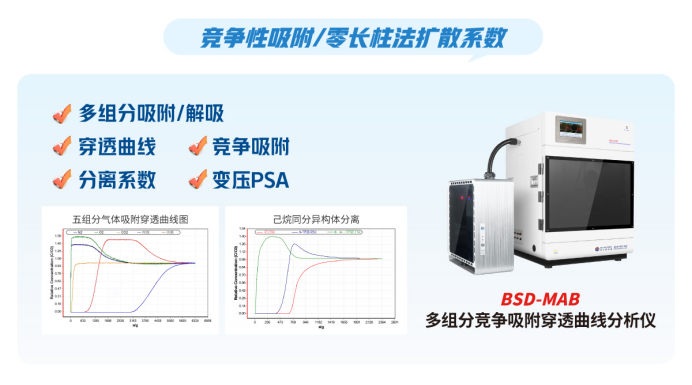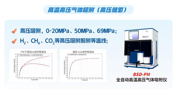 包括:高性能比表面积及微孔分析仪(BET比表面积,孔容孔径分析),全自动变温变压气体吸附仪(气体/蒸气吸附等温线、吸附热,IAST/分离系数),重量法气体蒸气吸附(气体/蒸气吸附量/吸附等温线、恒压吸附动力学、扩散系数、循环吸附、变温吸附),化学吸附(TPD/TPR/TPO/TPSR/,脉冲滴定,程序升温反应,催化剂分散度,金属表面积),多组分竞争吸附(多组分吸附/解吸,穿透曲线,竞争吸附,分离系数变压PSA),高温高压吸附(高压吸附,0-20MPa、50MPa、69MPa;H2、CH4、CO2等高压吸附,脱附等温线)。