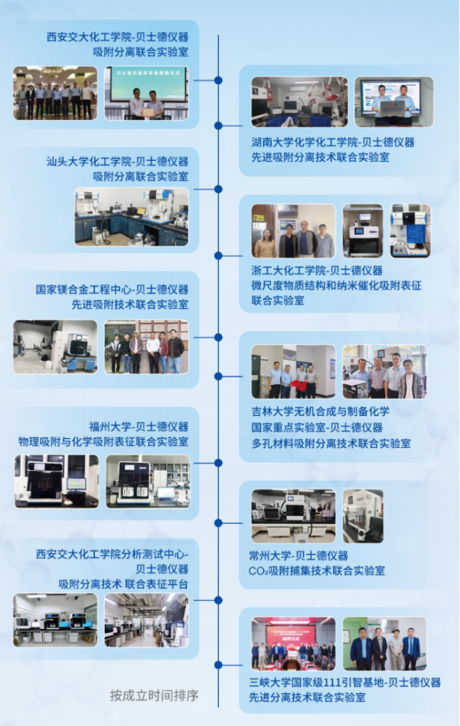 2020年9月,贝士德与西安交通大学共建首个“先进吸附分离技术”联合实验室。截至目前,贝士德已在全国建立了10个联合实验室(如下是联合实验室列表)。这种联合模式,一方面让科研机构能直接接触先进的表征手段,另一方面也让贝士德及时捕捉前沿科研动态与用户需求,从而不断优化产品,更加贴近实际使用场景。
