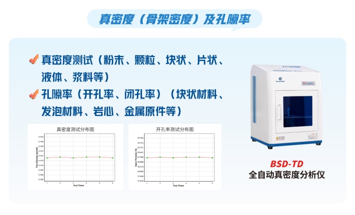 同时,贝士德也拓展到一系列相关的表征技术:如膜材料孔径分析(泡压法或液液驱替法,用于水处理膜、分离膜等的孔径评估)、真密度与孔隙率测试(气体膨胀置换法,计算材料的真实密度和孔隙率)。这些方法虽然不直接基于吸附原理,但与孔结构和界面表征紧密相关,丰富了整体的产品矩阵。