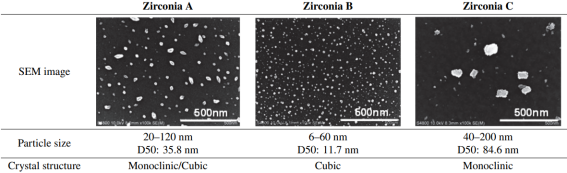 据研究文章,本次选用了三种不同晶体结构(混合A、立方B、单斜C)的氧化锆颗粒,通过XPS分析钇浓度间接评估氧空位含量,使用纳米压痕法测量颗粒的弹性模量,并且通过干式摇动实验模拟机械化学反应,使用XPS分析Zr–C键的形成率,以及在相同条件下比较三种氧化锆浆料与二氧化硅浆料对碳膜的抛光速率。