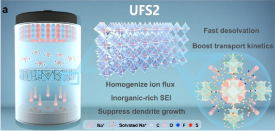中国科学技术大学曹晏课题组等人提出了一种创新的隔膜设计思路,通过将氟化物(−F)与磺酸(−SO3H)双极性功能团协同引入UIO-66金属有机框架(MOF)中,精准构建出具备极性调控与离子筛分功能的多功能隔膜,结果突显了协同功能基团策略在解决钠金属电池(SMBs)限制中的关键作用。