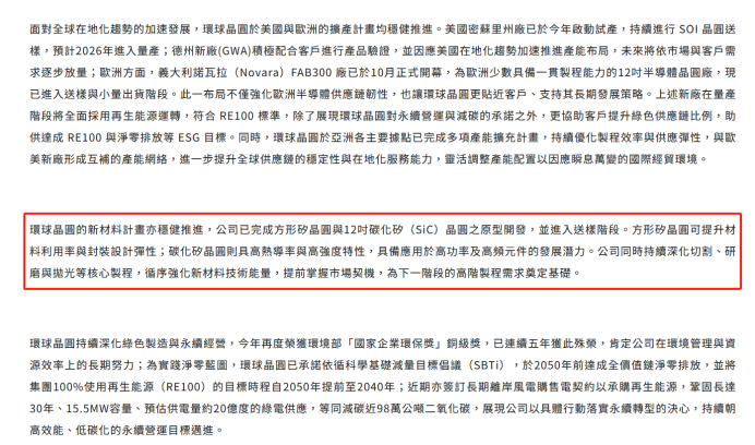 在业绩说明会上,环球晶董事长徐秀兰强调,当前全球碳化硅晶圆行业仍以8英寸产品为主流,12英寸技术尚处于产业化初期,公司此次直接攻克12英寸技术难关,具有里程碑意义。该产品核心优势显著:一方面可切割出更多芯片,大幅摊薄制造成本,为碳化硅器件大规模商业化扫清关键障碍;另一方面凭借优异导热性,能充分满足电动汽车、再生能源、高功率工业电源等领域对高效能、高功率密度元件的需求。