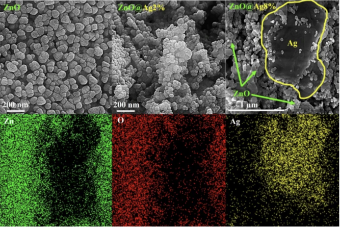 纯ZnO纳米颗粒、2%Ag掺杂ZnO纳米颗粒和8%Ag掺杂ZnO纳米颗粒的FESEM图像以及8%Ag掺杂ZnO纳米颗粒的元素映射图