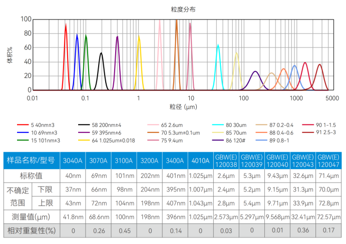 真理光学坚持用数据验证能力。在对40nm~3000μm的标样验证中,使用统一的反演模型一镜到底。结果显示,LT3900的D50测量值全部落入不确定度区间,重复性偏差远低于 0.5%。以下是部分具有代表性的样品数据: