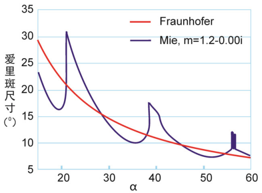 爱里斑尺寸(散射角)随粒径的变化,横坐标α为无因次参量,正比于粒径