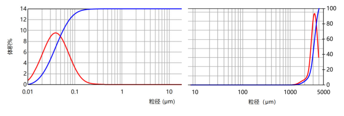 纳米级红墨水(左)及毫米级玻璃珠(右)的粒度分布