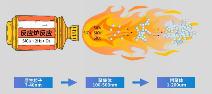 通过硅的卤化物在氢氧焰中高温水解反应得到一种纳米级无定形二氧化硅粉体就是气相二氧化硅。具体反应式如下: