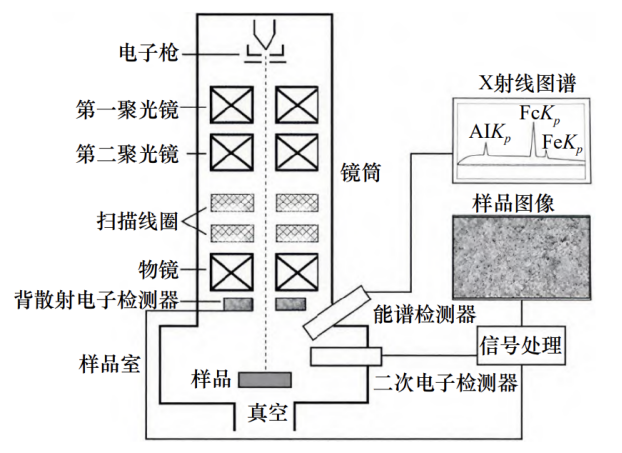 SEM仪器主要分为4个系统:电子光学系统(镜筒)、信号检测处理系统、真空系统与电子控制系统。其中电子光学系统包含电子枪、电磁透镜、扫描线圈、样品室等主要部件,而电子枪位于镜筒顶部,是扫描电镜的电子束发射源。