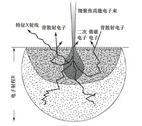 入射电子束穿透的深度与加速电压成正比,与样品的密度成反比,会在样品内部形成一定穿透深度的相互作用区(如下图)。入射电子与样品相互作用产生的各种信号反映了样品表面的形貌或成分,分别被不同检测器接收,经过信号转换、放大,由计算机转化为可供观察和记录的数字图像或谱线。