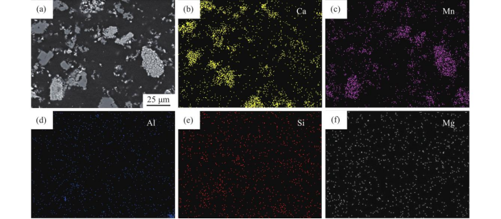 锰矿样的微观形貌和元素分布情况。(a) 扫描电镜图;(b)~(f) EDS元素面分布