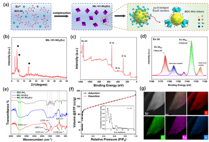 研究团队通过一步水热合成策略,成功制备出具有内在双色荧光特性的MIL-101-NH2(Eu)金属有机框架(MOF)材料。该材料的核心机理在于巧妙利用镧系金属离子铕(Eu3+)的“天线效应”。通过将镧系金属离子和 BDC-NH2作为前驱体材料引入MOFs结构中,在无水环境下,镧系金属离子(Eu3+)显示出增强的特征红色荧光;当水分子进入材料的孔隙结构时,配体-水结构有利于激发态下从给体单元到受体单元的分子内电荷转移,削弱天线效应,材料的荧光从红色转变为蓝色。因此,传感器能够通过肉眼可见的颜色变化实现痕量水的可视化检测,展现出较低的检测限。