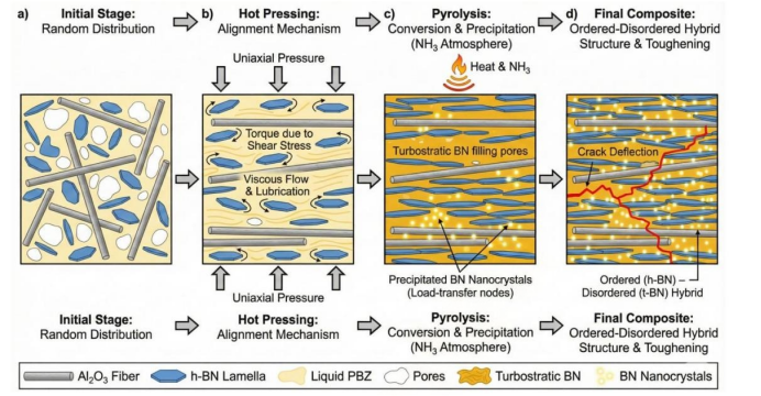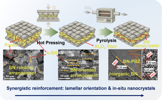 针对上述难题,研究团队创造性地引入了液相聚硼氮烷(PBZ)作为反应性粘结剂和前驱体。在热压过程中,液态PBZ的润滑作用促使刚性h-BN片层发生定向排列,形成有序的层状“织构”。随后,通过单次高温热解,PBZ转化为连续的氮化硼基体,并原位析出纳米晶。这一“液相辅助定向+单步致密化”的策略,从根本上避免了传统多循环工艺的弊端。