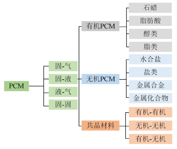 根据材料相变特性,PCM可以区分为固-气相变、固-液相变、液-气相变和固-固相变四类。其中固-液相变类型的PCM由于其相变过程体积几乎没有变化、相变潜热高和相变温度适应范围广而被广泛应用于储能和热管理等领域。