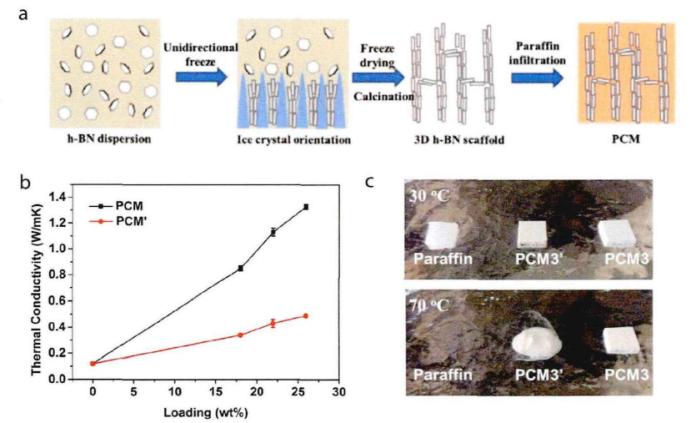 氮化硼是一种层状二维材料,具有良好的本征导热率(面内导热系数为30Wm-1k-1,面外导热系数为600Wm-1k-1),耐高温且化学性质稳定,相较于碳材料成本低。由于与石墨具有类似的结构,氮化硼在粘合剂和支撑材料的帮助下也可以构筑三维结构。