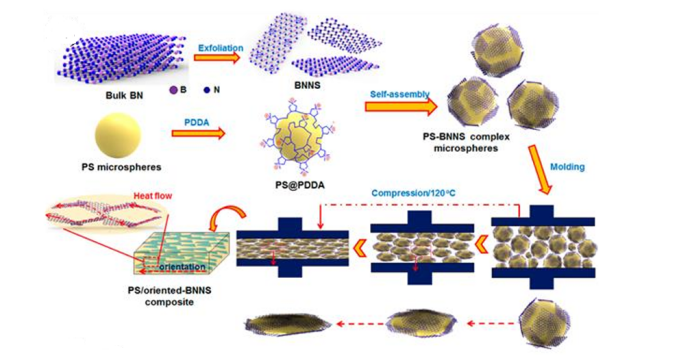 比如,复旦大学的 Wang等报道了带正电荷的改性聚苯乙烯微球和带负电荷的 氮化硼纳米片通过它们之间强烈的静电相互作用自组装形成复合微球,然后通过 在玻璃化转变温度附近的热压使氮化硼纳米片选择性地分布在变形的聚苯乙烯 微球的界面上。这种均匀且定向良好的氮化硼纳米片填充网络可以作为热传递的导热路径,得益于这种独特的结构,在 13.4% 的低填充量下,所得复 合材料的导热系数显著提高到了 8.0 W/m·K。