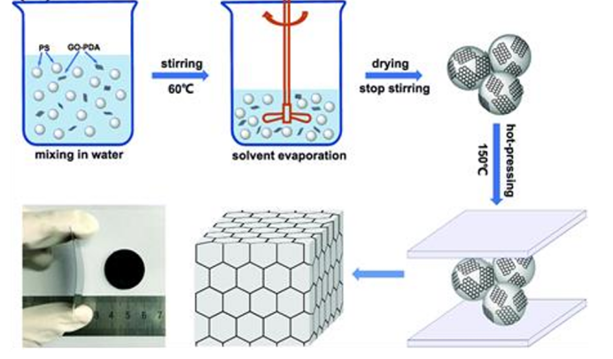 比如,江南大学的Yuan将聚多巴胺涂覆在氧化石墨烯表面,然后与聚苯乙烯微球混合,每个非极性聚苯乙烯微球的表面都能提供π-π键,使分散的氧化石墨烯-聚多巴胺片能够稳定地固定在微球表面,经过热压在聚苯乙烯颗粒之间形成完整均匀的聚多巴胺-氧化石墨烯网络,使得复合膜的导热性能与电磁屏蔽性能有了很大的提高。