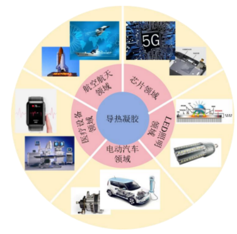 导热凝胶具有热导率大,耐高低温性能、绝缘性好、可重复使用等优点而被广泛应用。而其综合性能提升的关键在于合理设计基体和填料的性质,基体的设计可以从聚合物的类型、相对分子质量及其分布、交联剂、扩链剂等方面进行设计,而填料的设计可以从提高导热性方面进行探索,如对传统导热填料进行表面功能化以及设计复合填料。通过对凝胶结构的合理调控,可以使其具有比传统材料更高的散热效率,从而保证其在高载荷环境下工作时能够有效地控制其温度,延长器件的使用寿命和稳定性。