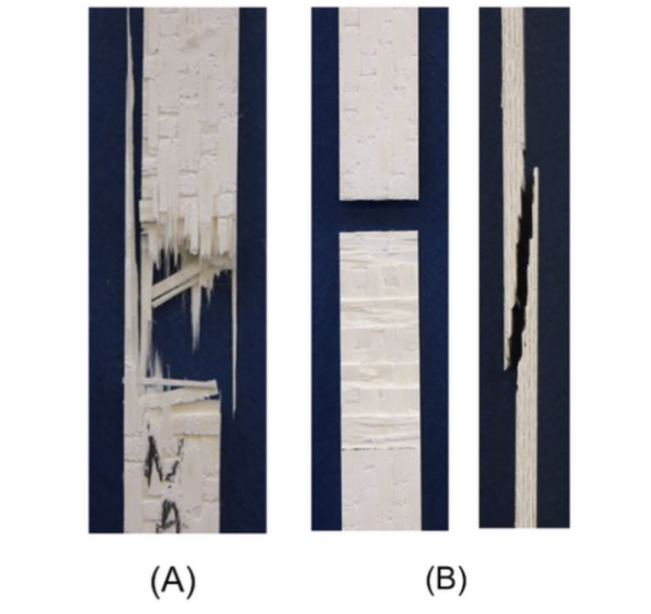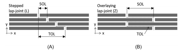 两种搭接方式的失效对比:(A)重叠式接头;(B)阶梯式接头