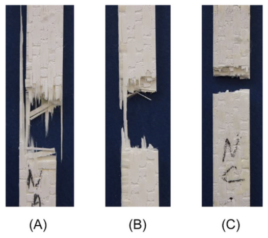 原始拉伸试样的典型失效模式:(A)1200℃烧结试样中出现明显的纤维和纤维束拔出;(B)1250℃烧结试样中出现非脆性失效,纤维束拔出不太明显;(C)1280℃烧结试样中出现脆性拉伸失效