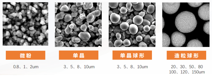 ·形态结构:氧化铝形态多样,包括球形、类球形、片状、多面体、角形等,并向单晶化发展,原晶粒度在0.5-90μm内可定制;氮化硼、氮化铝等氮化物粉体也向球形、单晶化发展。