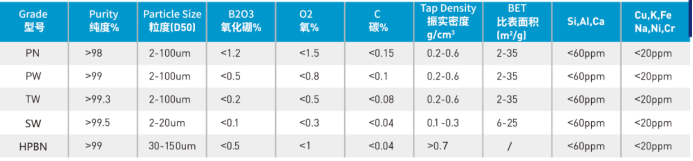 天元航材小粒径(≤4um)、中粒径(8~12um)、大粒径(≥27um)六方氮化硼及相关产品指标