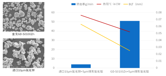 2.5D和3D高端芯片封装中,芯片表面钝化层、微凸点和底层填充胶等脆弱结构易划伤、磨损,要求在低压力下实现良好的界面接触。填料低硬度利于压缩,准球形大颗粒利于减缓黏度上升,提高填充量。金戈新材“大颗粒氧化锌”具有硬度低(4-5)、质软、纯度高(ZnO≥99.5%)、表面光滑等特点,其准球致密结构在相同配方中可实现比进口同类产品更高的填充量。以下实验表明,在统一凝胶体系中,填充该产品的材料具有更低BLT值、更低热阻和更高挤出率,显著提升工艺适应性与散热效率。