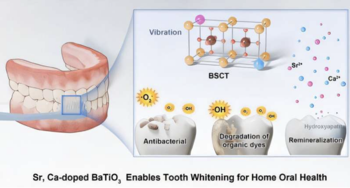 研究人员将锶、钙离子引入钛酸钡体系,制备得到一种陶瓷粉体材料,命名为BSCT。该材料具有典型的压电效应:在受到电动牙刷振动时,粉体会在微观尺度产生电场,从而触发一系列化学反应,生成具有美白作用的活性氧物种。