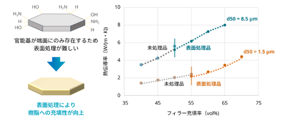 解决:Resonac开发了热传导率优异的鳞片状氮化硼(BN)填料,并进行改性处理以提高填料相容性,关键点就在于BN呈鳞片状,其端面上仅存在如羟基或氨基等反应性较高的官能团,因此表面处理被认为比较困难。Resonac推出通过化学方法进行大规模处理的“ST-BN”。