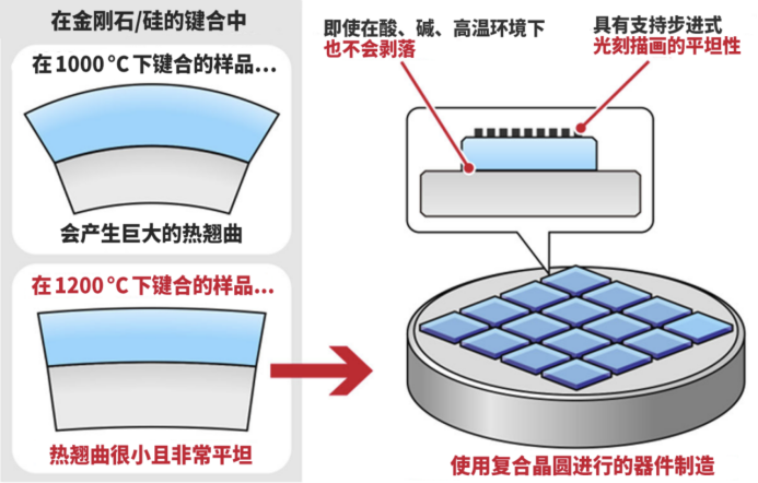 物理特性发现:研究人员注意到金刚石与硅的热膨胀系数在约600℃时会发生逆转。计算显示,接合温度越高,当复合体冷却至室温时,两者的热收缩量差异反而会减小,从而降低残留应力导致的翘曲。