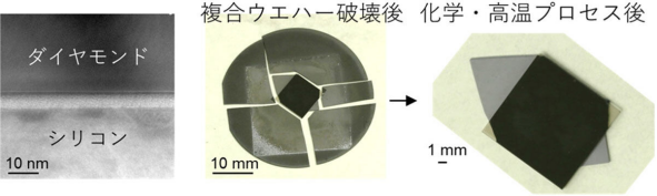 由于控制了热变形,该复合外延片在曝光工艺中表现出色:在10mm见方的绘图区域内,95%的面积能够成功实现1μm宽度的细微线条加工。 此外,即使金刚石基板表面相对粗糙(均方根高度Sq为0.9nm),在高温下仍能形成牢固接合。电子显微镜观察显示,两者界面通过一层约5nm的非晶层紧密结合。即使对硅片施加足以使其破碎的冲击,除边缘微小部分外,金刚石层并未发生剥离。