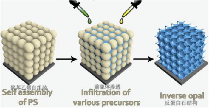 备注:opal / inverse opal(单分散微球自组装形成的三维有序球阵列结构 / 以 opal 为模板反向复制得到的三维有序孔结构)