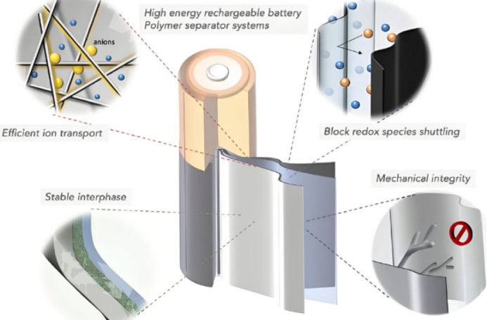 电池隔膜是锂离子电池中的关键内层组件,虽不直接参与电化学反应,却起着隔绝正负极防止短路、同时允许锂离子自由通过以形成闭合回路的核心作用,其微观结构和界面特性直接影响电池的离子电导率、循环稳定性以及安全性。当前商业化应用最广泛的是聚丙烯(PP)和聚乙烯(PE)等聚烯烃类隔膜,虽具有机械强度适中、电化学稳定、成本较低等优点,但其热稳定性差、对电解液浸润性不佳的本征缺陷日益成为制约高能量密度电池发展的瓶颈。