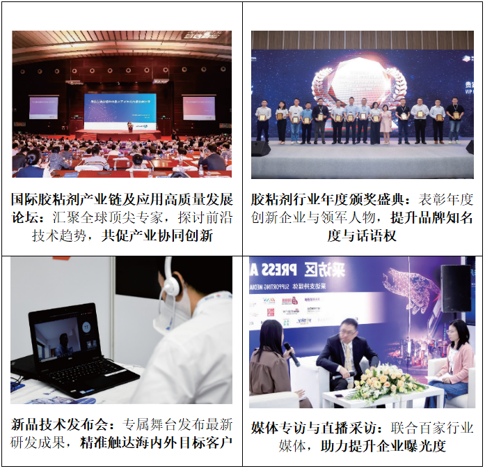 自展会创办以来,始终以专业、权威的办展理念,吸引了全球胶粘剂及化工原料领域的龙头企业与优质品牌持续参展,形成强大的品牌集聚效应,成为行业内极具影响力的专业盛会。