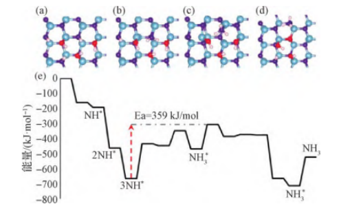 注:(a)3个H2O分子的解离吸附产生的3NH*;(b)由羟基介导的质子接力形成的NH2*;(c)NH3*和一个瞬时形成的N表面空位;(d)O填充N空位后的NH3*,导致表面氧化;(e)三水机制中NH3的生成和解吸途径