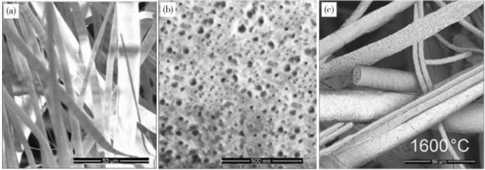 在500℃和1600℃下加热的多孔Al2O3纤维的SEM图,放大倍数分别为1000倍、100万倍和1000倍