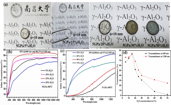 本次研究的γ-Al₂O₃为立方晶型,具有高对称性,因此各晶粒的光学性质在宏观上均一,光线可以顺畅地穿过晶界,为透明提供了先天条件。但是γ-Al₂O₃作为非稳态氧化铝,在常规烧结(≈1250℃)温度下会相变为稳态α-Al₂O₃,光学优势也随之消失。本次科研团队就是采用了一种H2O辅助高压烧结(HPS)策略,使烧结温度低至300℃,以H2O浓度(5–75 wt.%)作为瞬态溶剂,结合对高压的精确控制,实现了接近理论密度(>99%)和卓越的光学透射率(在可见范围内>80%)。