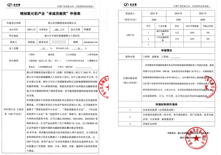 参评单位唐山世邦陶瓷设备有限公司参选奖项为“卓越贡献奖”。该奖项旨在授予长期以来服务精细氧化铝产业的材料、装备和其他服务企业,为全行业的技术进步和产品升级形成关键支撑的优秀供应商。