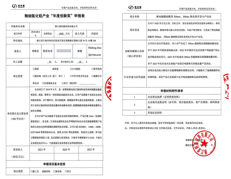 本次参评单位浙江爱科新材料有限公司,申报奖项为“年度创新奖”。该奖项旨在授予在2025年度在精细氧化铝领域技术研发、工艺突破或应用拓展中取得显著创新成果,并推动行业技术进步的企业或团队。