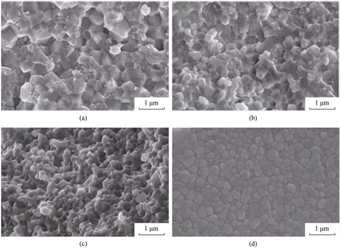 不同烧结方法制备氧化锆的显微结构照片:(a)无压烧结氧化锆断面;(b)热压烧结氧化锆断面;(c)振荡压力烧结氧化锆断面;(d)振荡压力烧结氧化锆抛光表面