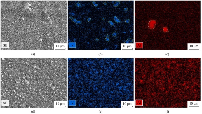 WBM样品(a)和NCP样品(d)坯体表面的SEM照片及其对应的Y (b,e)和Al (c,f)的EDS能谱