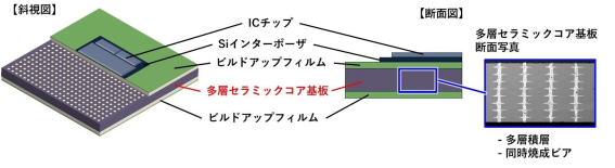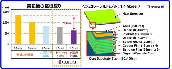 面对AI数据中心的高功耗,大芯片以及芯片上的凸点间距越来越密的趋势,原有机封装基板与芯片热膨胀系数不匹配导致的整体弯曲会导致焊点断裂、接触不良,并且也难以做出细线宽/线距。京瓷开发这种高刚性、低热膨胀的陶瓷材料作为基板核心层,即作为面向下一代超大尺寸 AI 芯片封装(如超过 100×100mm)的解决方案。