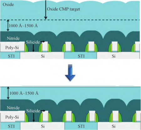 STI主要用于分隔相邻晶体管,具体工艺为:首先在硅衬底上依次沉积氧化硅层和氮化硅层,前者起到初步电气隔离作用,后者作为阻挡层,用于保护硅衬底在后续热氧化与刻蚀过程中不受损伤。之后再刻蚀出浅沟槽并填充绝缘氧化物(通常为SiO₂),最终通过CMP去除沟槽外多余的氧化物,仅保留沟槽内的隔离层,使氧化物表面与氮化硅阻挡层表面共面。在该过程中,CMP抛光核心难点在于选择性控制,要求在完全去除沟槽外氧化物的同时,尽可能减少沟槽内氧化物的过度去除,以及抑制Si₃N₄阻挡层去除,避免产生“沟槽氧化物蝶形凹陷”。