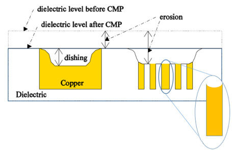 (2)侵蚀:主要发生在密集排列的细金属线阵列周围。在高图形密度区域,抛光垫的局部压力分布更为集中,加上化学作用的协同效应,导致介质层被过度去除而显著减薄。侵蚀会改变层间介质的有效厚度,影响寄生电容,进而干扰电路的电学性能,同时增大表面台阶高度,使后续CMP难以实现全局平坦化。