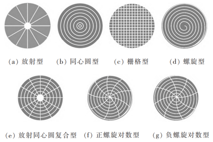 ·沟槽设计:抛光垫表面的径向或螺旋沟槽有助于抛光液的均匀分布和快速更新,同时优化废料排出效率,目前常见的沟槽形式有放射型、网格型、圆环型以及螺旋对数型等,通常将多种沟槽结构结合设计成效果普遍比单一型更优。